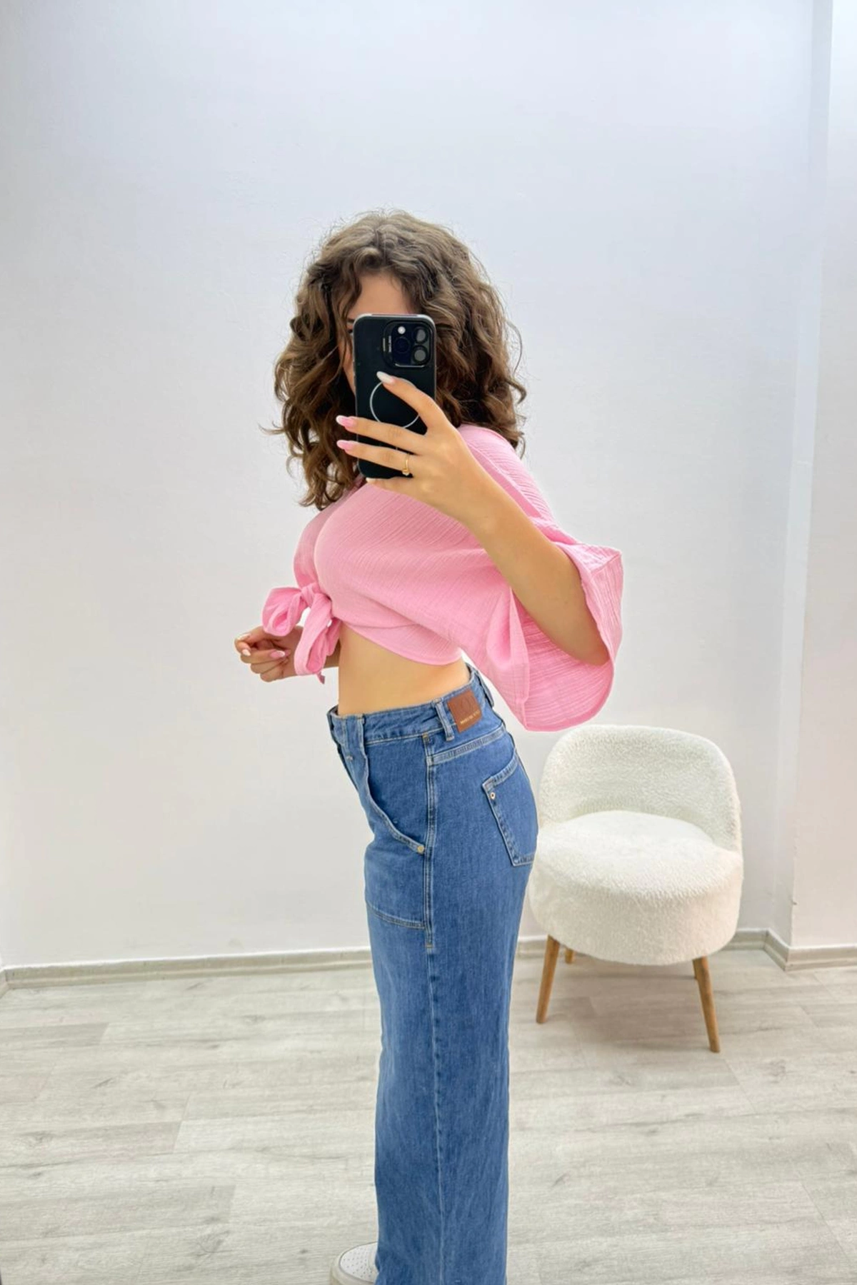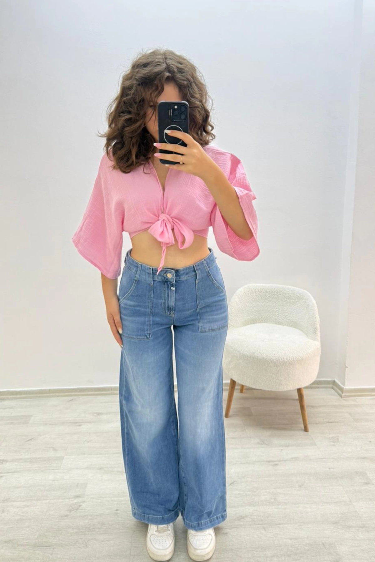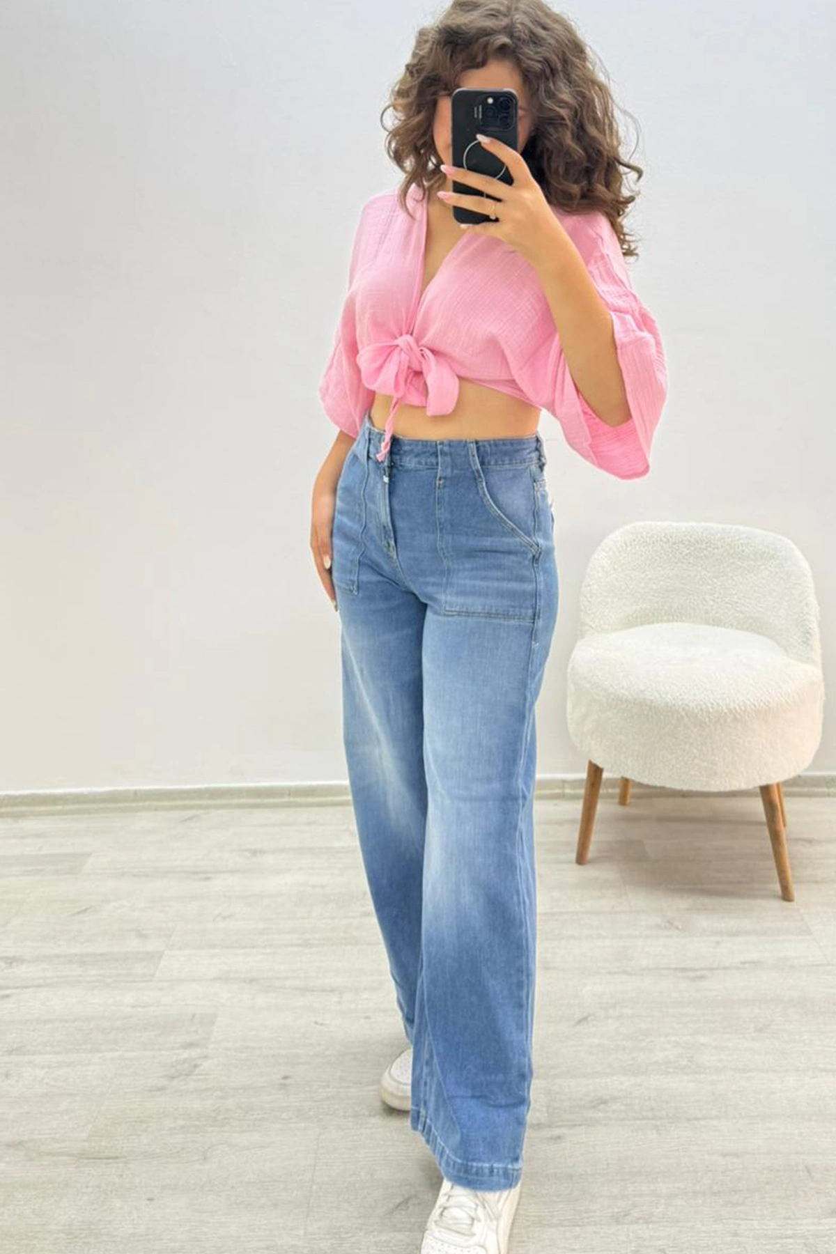 Mihrim Butik'in cepli rahat kesim mavi jean pantolonu, şıklığı ve konforu bir arada sunuyor.