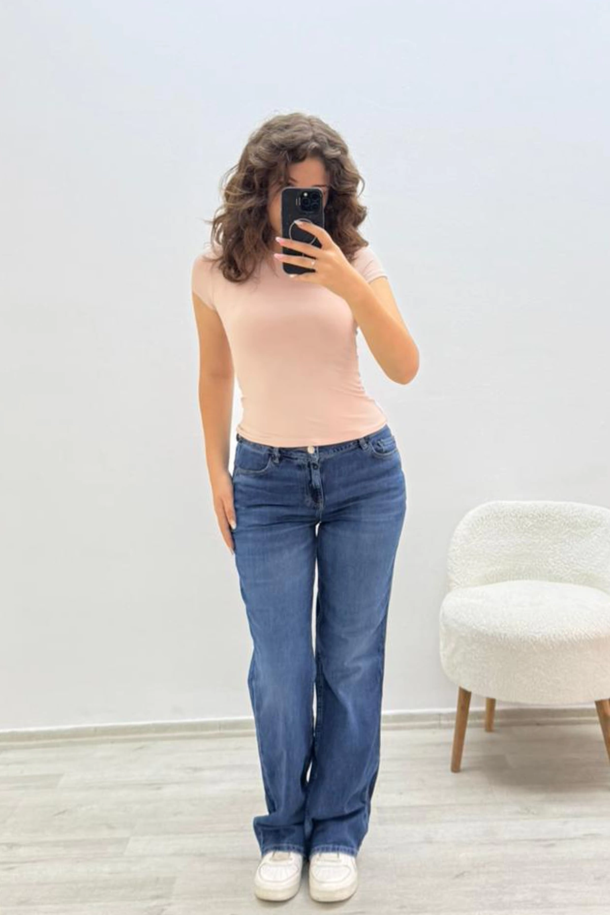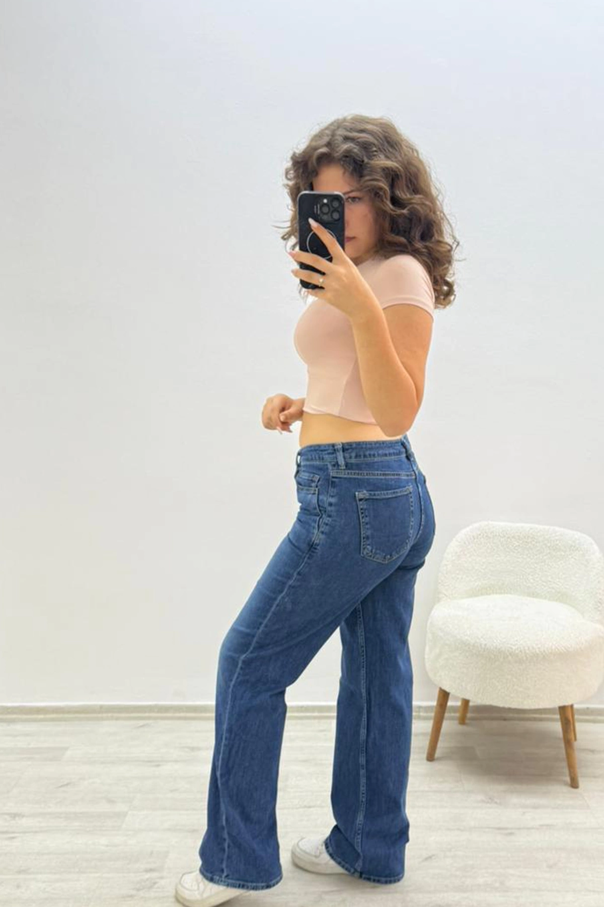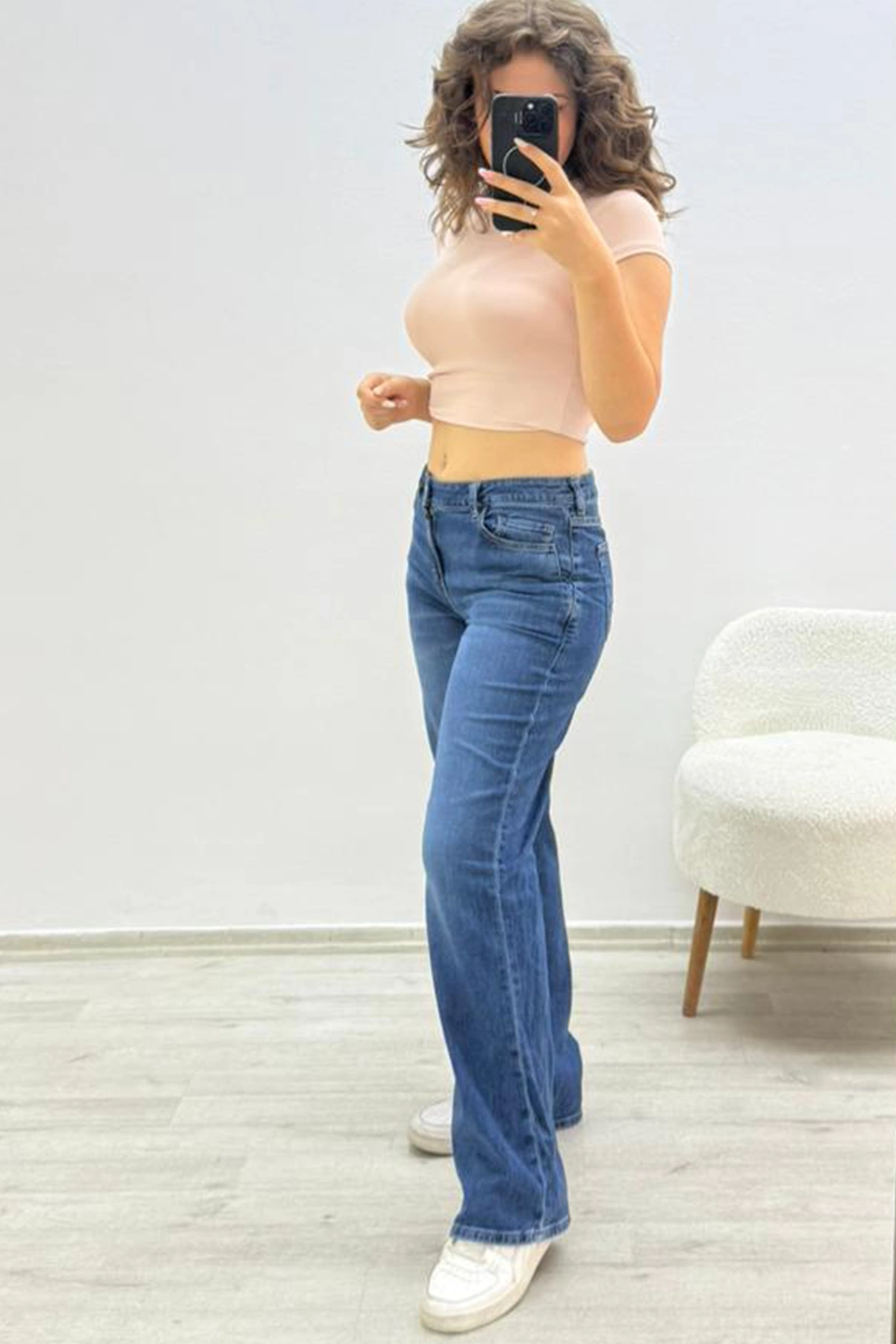 Mihrim Butik koleksiyonundan şık ve rahat bir seçenek olan Koyu Mavi Düz Paça Mavi Jean Pantolon, gardırobunuzun vazgeçilmezi olmaya aday.