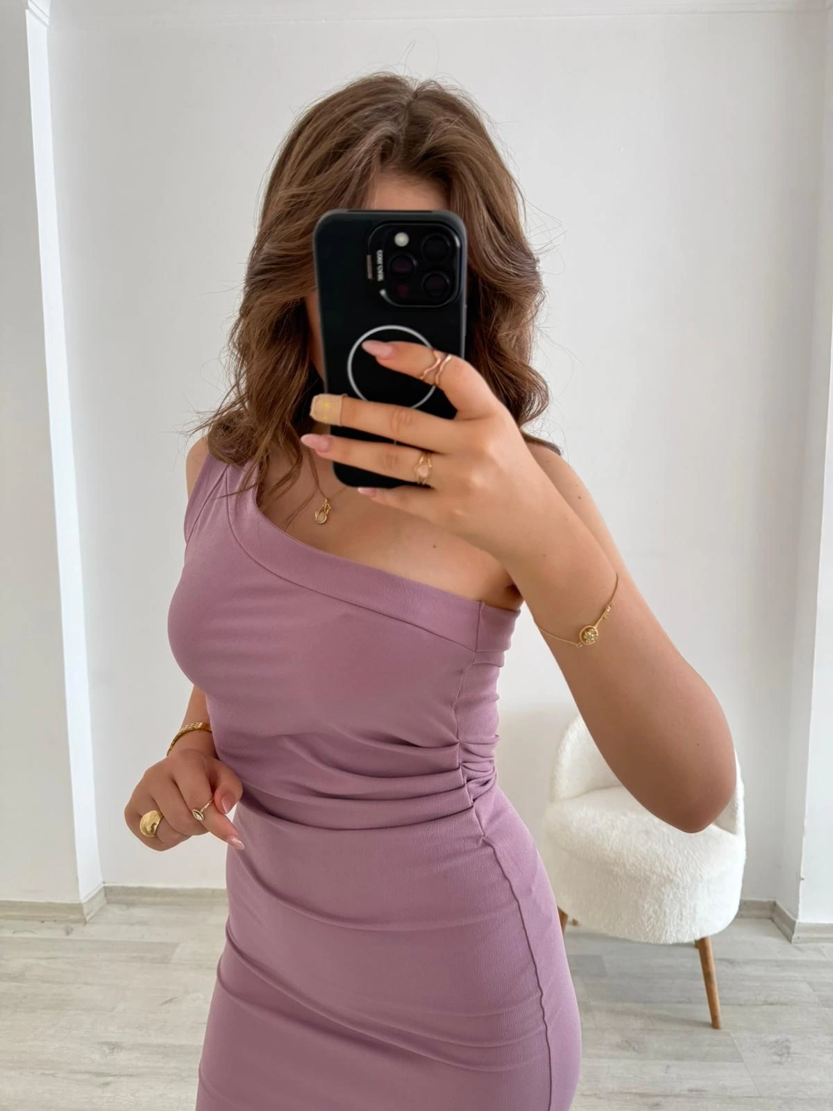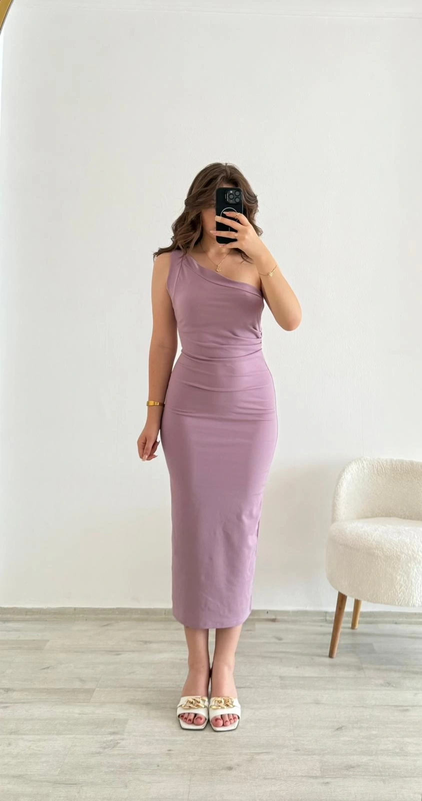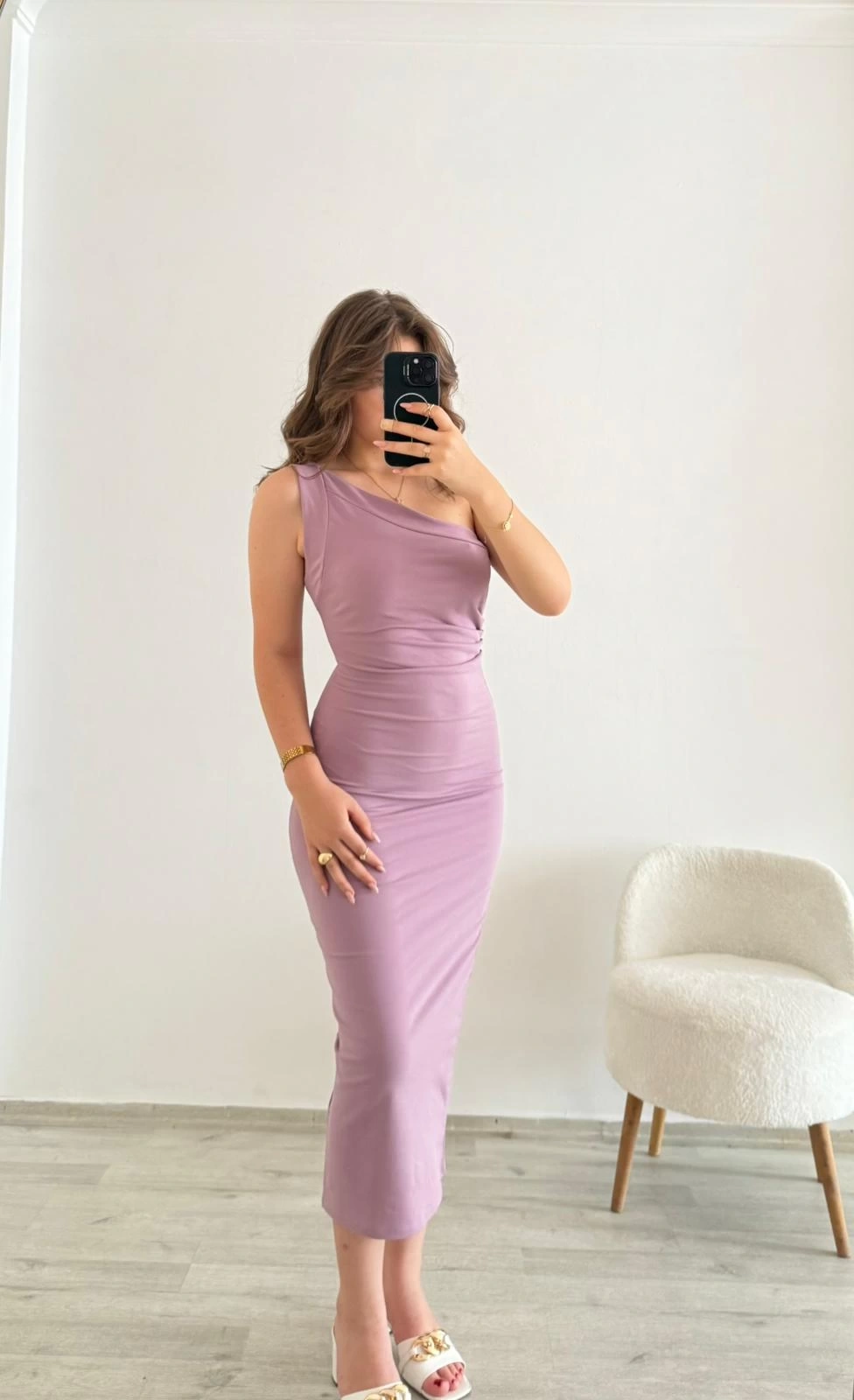 Zarafeti ve modern çizgileri bir araya getiren bu tek omuz lila midi elbise, vücuda oturan kalıbıyla feminen bir siluet sunar. Esnek ve kaliteli kumaşı sayesinde gün boyu rahatlık sağlarken, minimal tasarımı şıklığınızdan ödün vermeden her ortama uyum sağlar. Düğün, davet, mezuniyet veya özel günlerde stilinizi ön plana çıkaracak mükemmel bir tercihtir.
