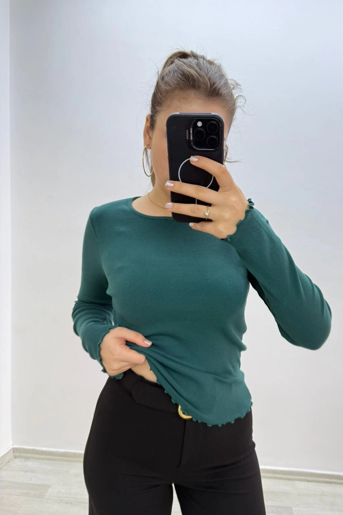 Yumuşak dokulu, esnek rib kumaştan üretilen bu uzun kollu bluz, gün boyu konforlu bir kullanım sunar. %95 pamuk ve %5 elastan karışımıyla nefes alan yapıya sahiptir ve vücuda nazikçe oturarak formunu korur. Kollarında ve etek ucunda yer alan dalgalı overlock dikiş detayı, sade siluetine feminen bir dokunuş katar. Yuvarlak yaka kesimiyle her stile uyum sağlar.