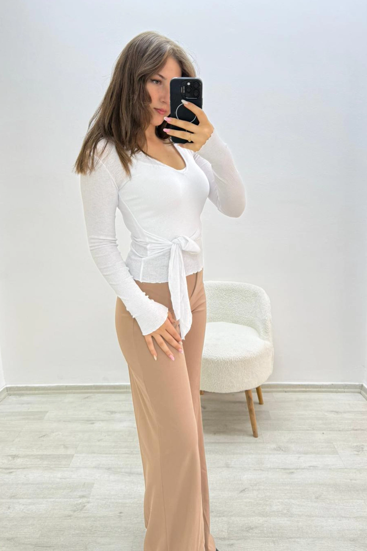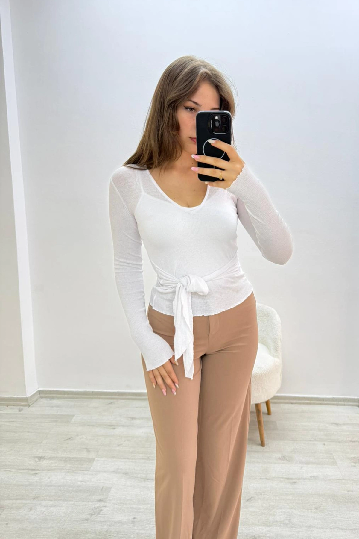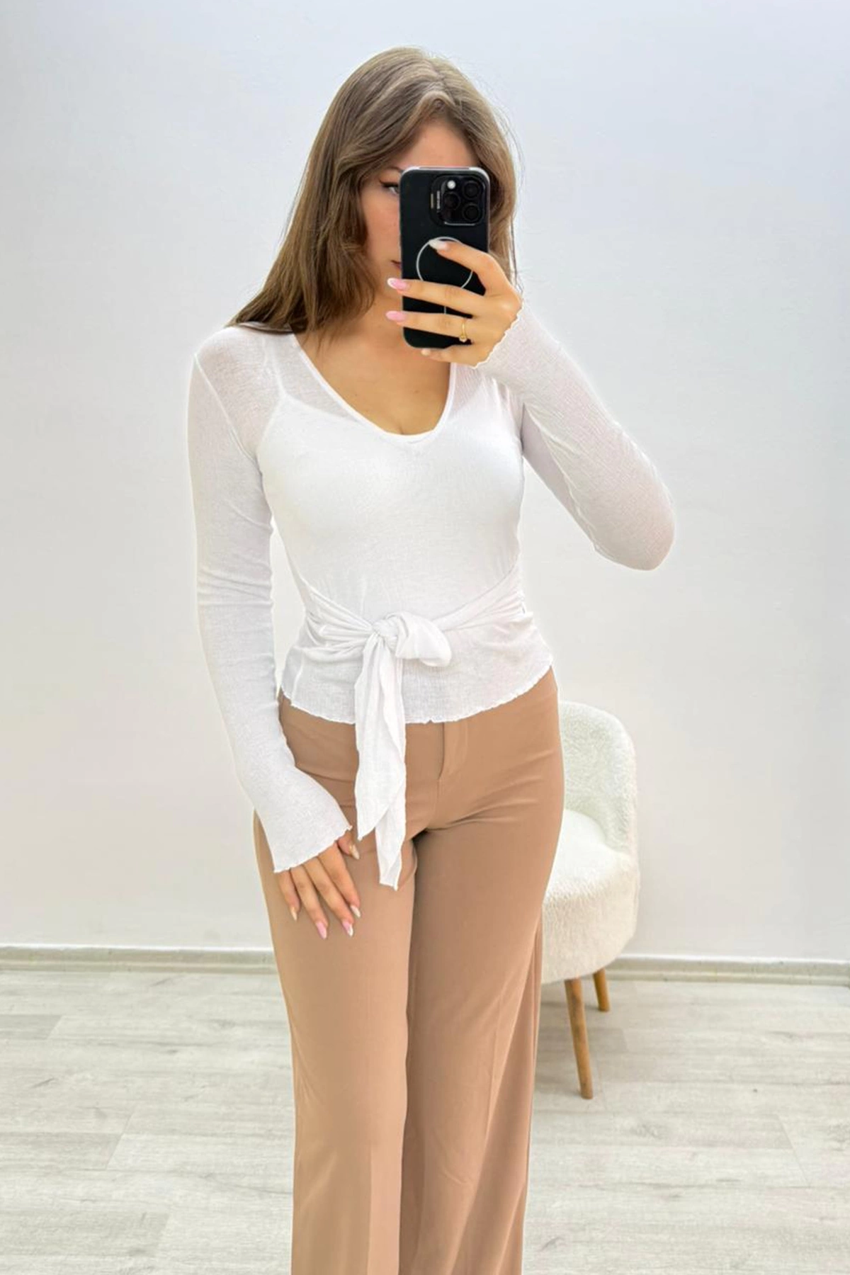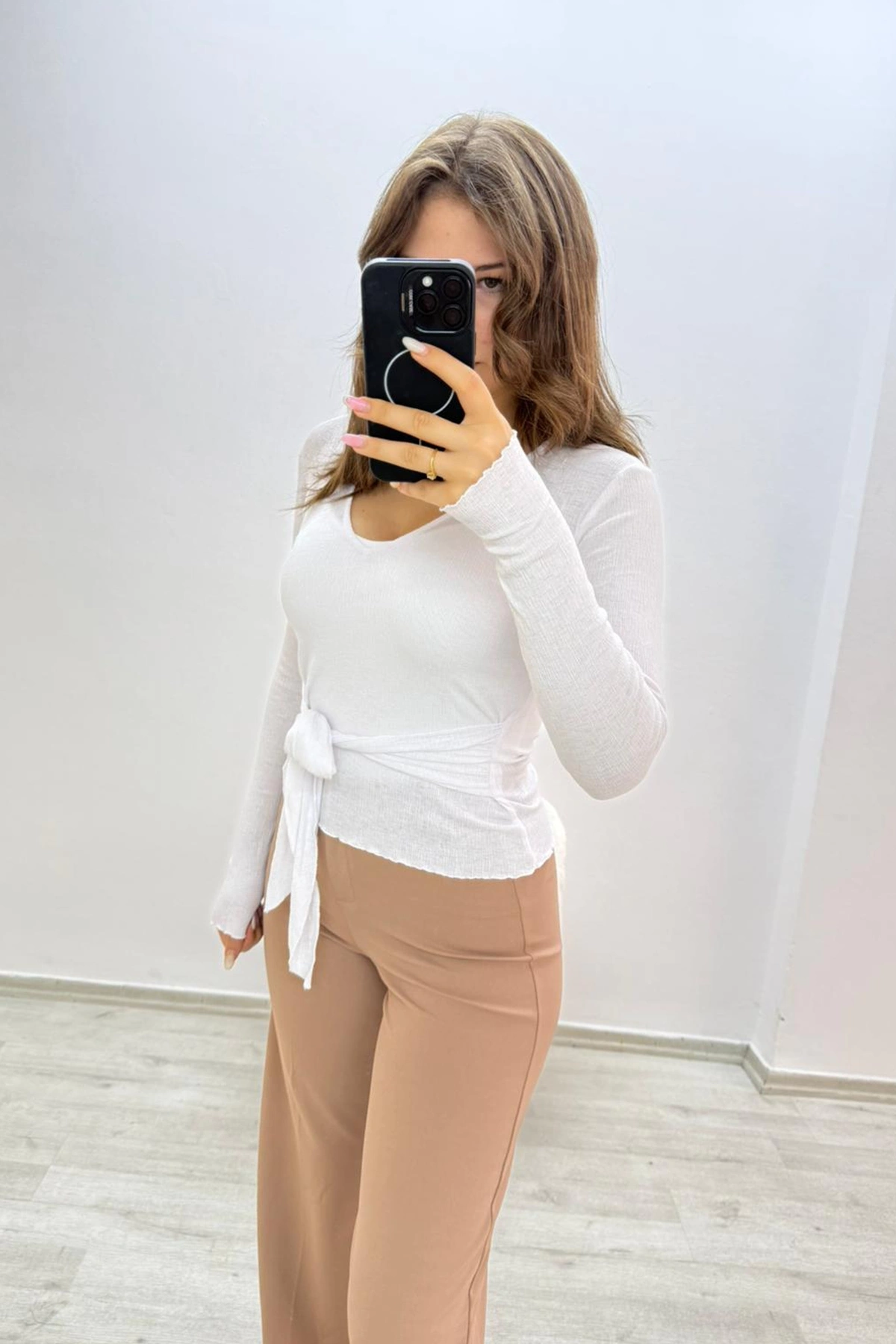 Mihrim Butik'in şık ve rahat tasarımı olan Yandan Bağlamalı Beyaz Triko ile tarzınızı yansıtın.