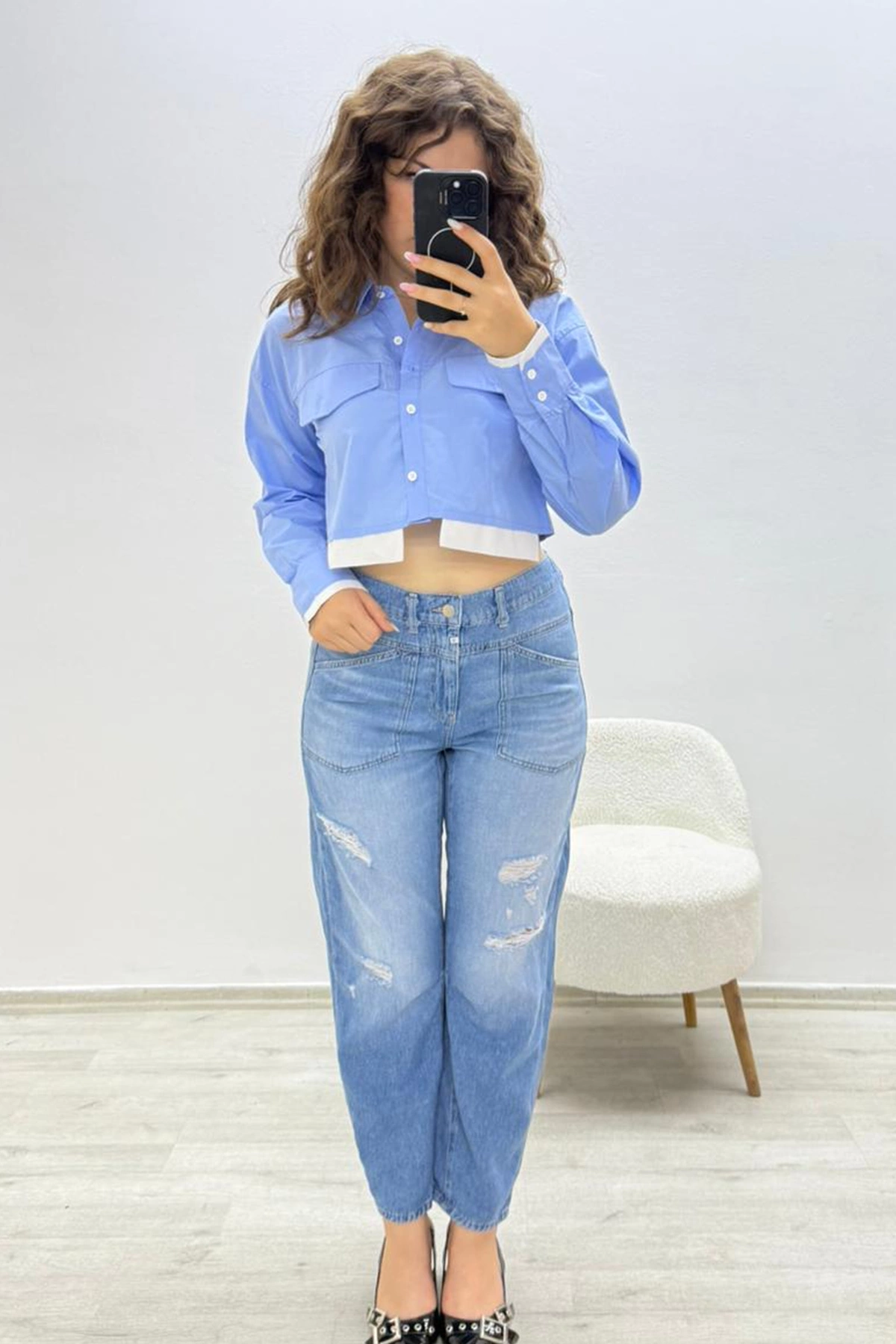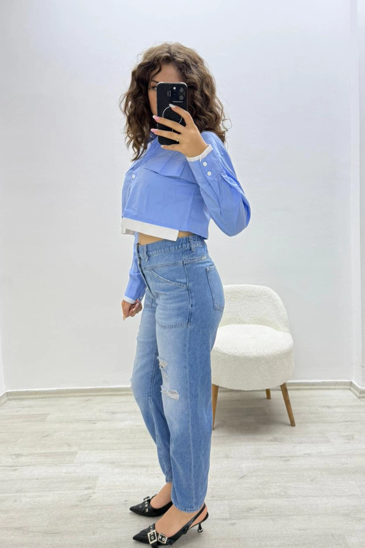 Mihrim Butik'in Yırtık Detaylı Mom Mavi Jean Pantolonu, şıklığı ve rahatlığı bir araya getiriyor.