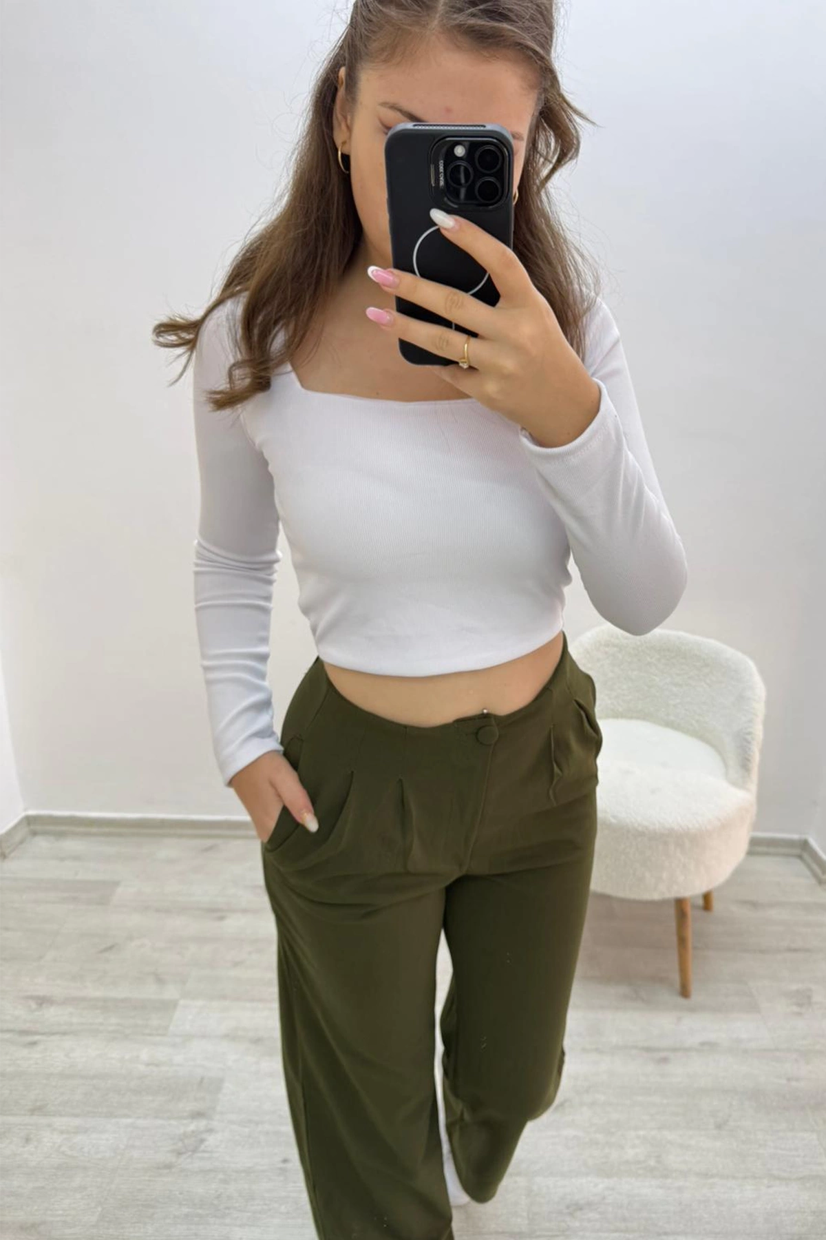 Yüksek Bel Beli Lastikli Plazo Yeşil Pantolon, gardırobunuza hareket katacak şık bir parça.