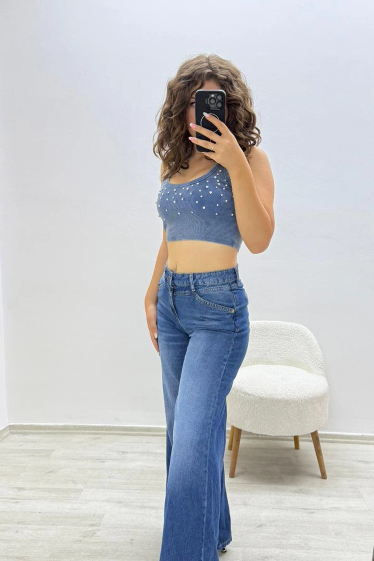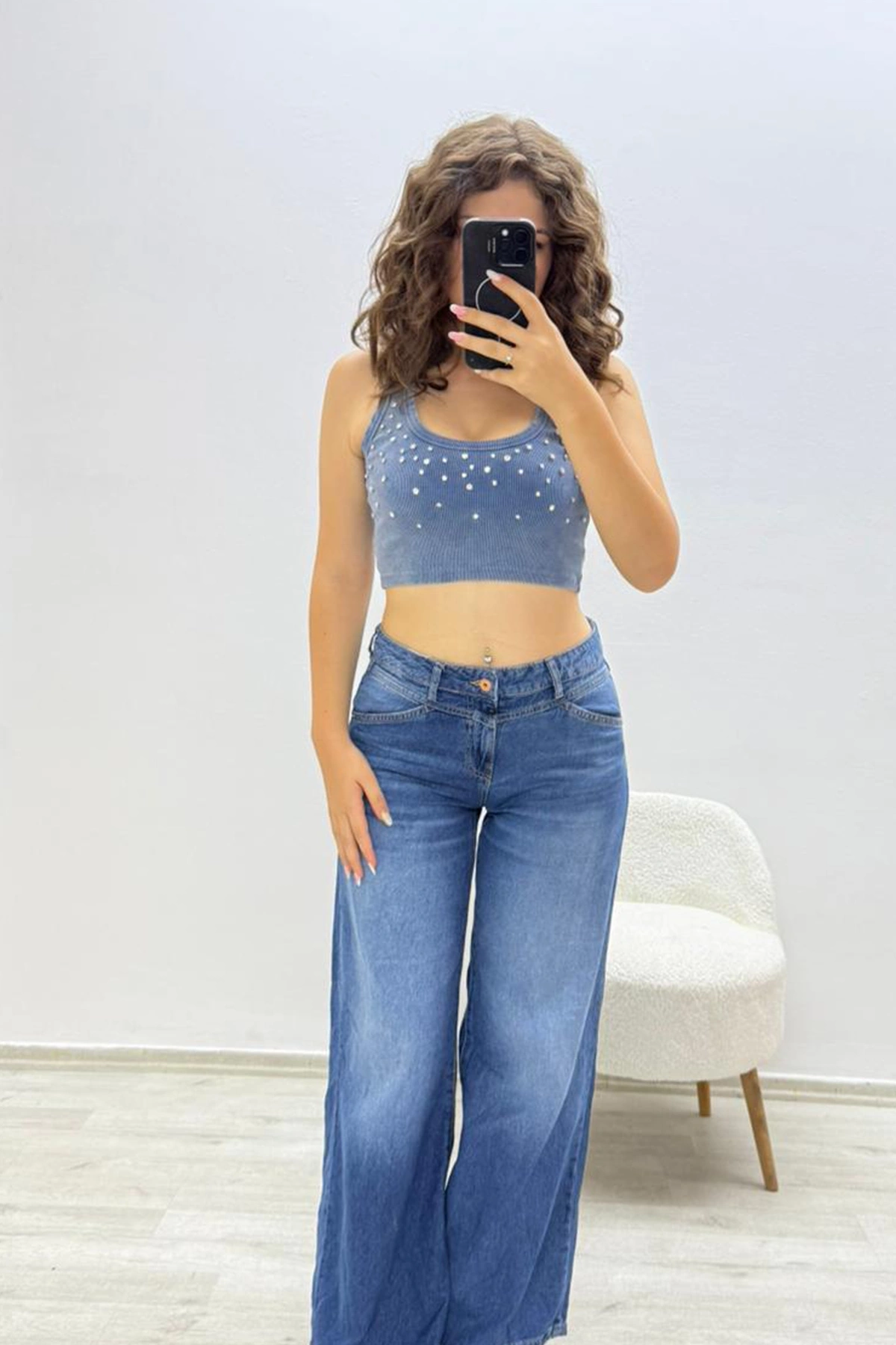 Bu sezonun trendlerine uygun olan Geniş Paça Koyu Mavi Jean Pantolon ile tarzınızı ön plana çıkarın!